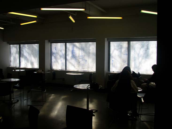 | Plastic Painting: Frost Installation: OCAD University Cafe, Toronto, acrylic paint in plastic cling wrap over windows, 2007. Return to Installation Menu | Return to Frost Installation Menu | Artist Statement |